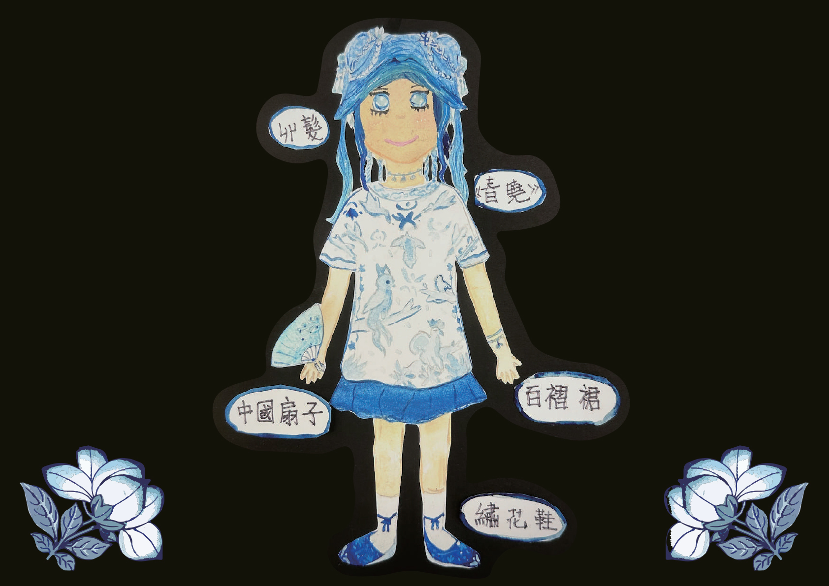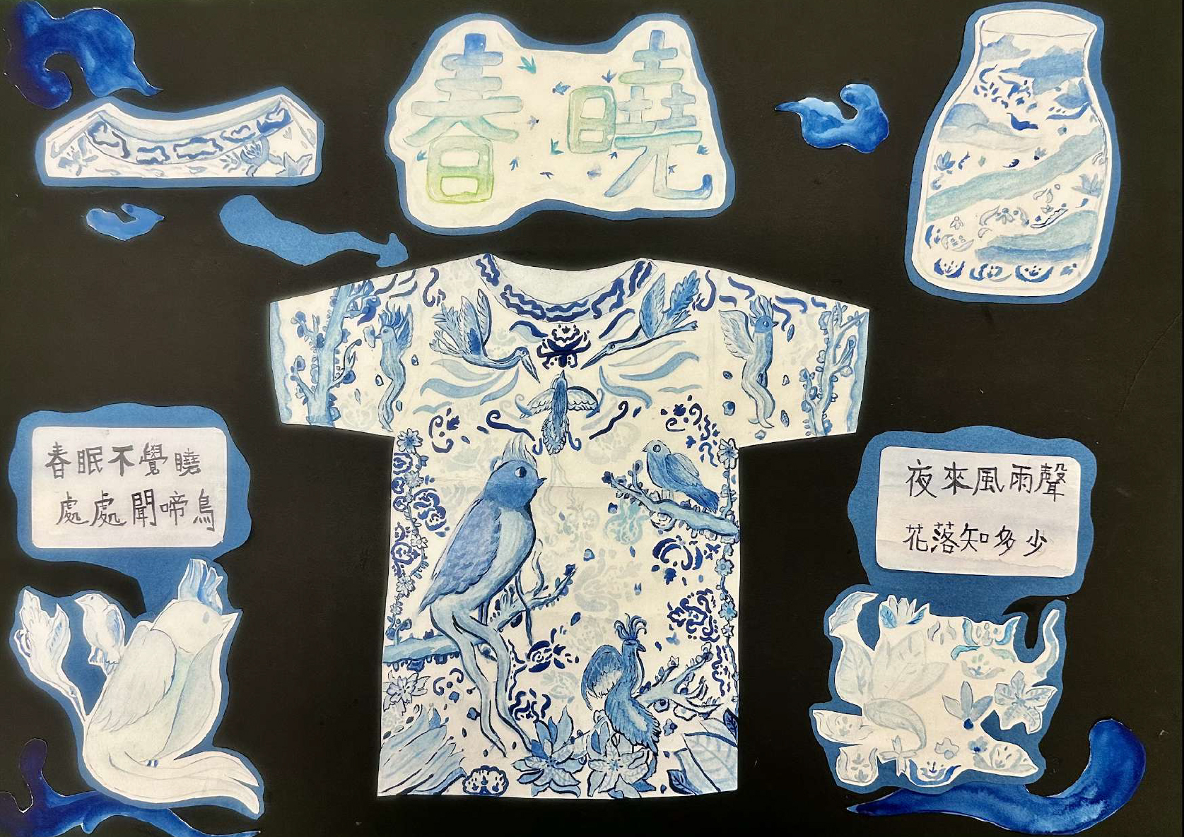 我受到唐代詩人孟浩然的詩歌《春曉》啟發而創作的。詩中描述了清晨醒來時春天的美景,展現了人們對春天的珍惜之情。我選用了中國青花瓷的花紋和色彩作為設計靈感,青花瓷自唐代開始創造,正好與這首詩產生了共鳴。我運用青花瓷的鈷藍色繪製出詩中描繪的景色。作品不旦融合了詩歌與藝術的美感,亦展現了中國傳統藝術的獨特魅力和融合現代時尚的能力。