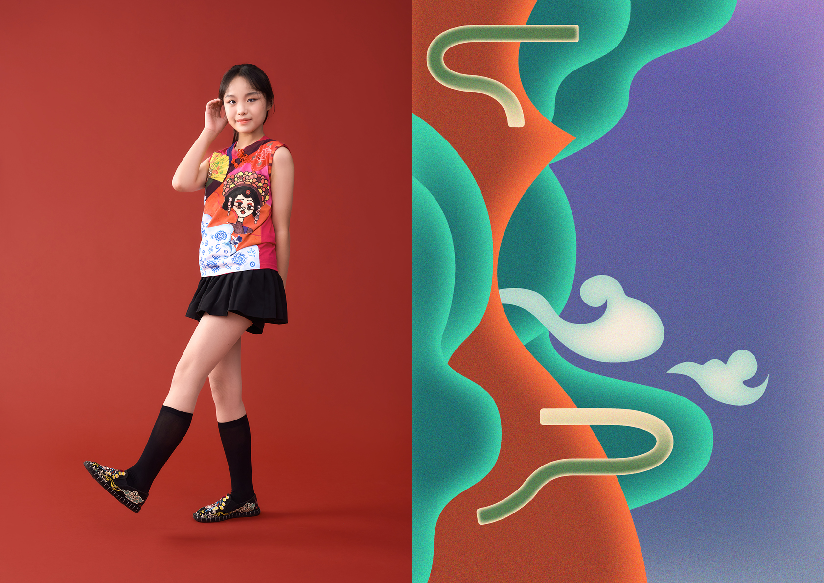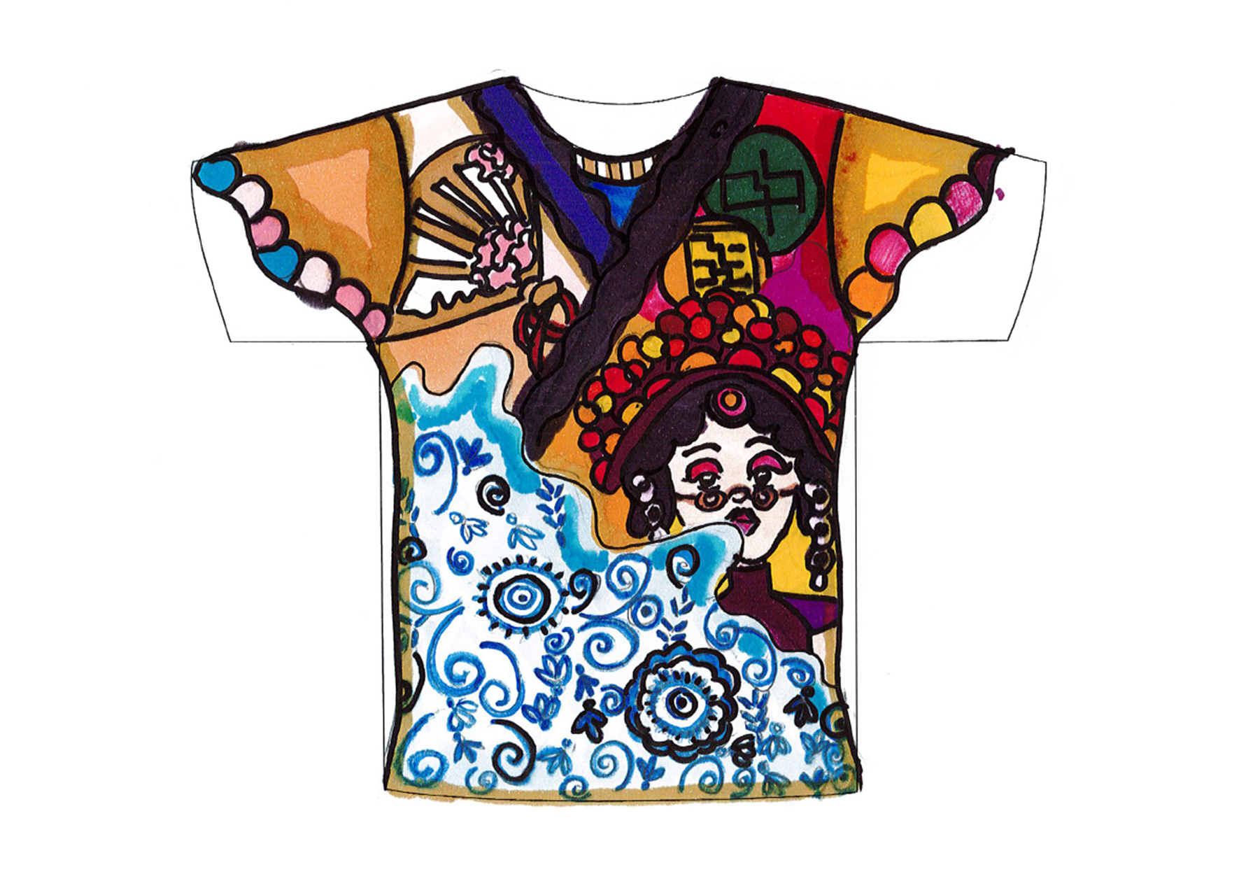 我的創作理念是和中國文化藝術相關聯的,作品裡有青花瓷的元素:青花瓷表達了我對中國瓷器的敬佩;中國扇子:中國扇子有粉紅色梅花;古代衣領:古時候的Y形衣領;「中國」的藝術字體,表達了這是中國特色服裝;京劇花旦:戴著傳統京劇的頭飾,還有她那架眼鏡也是擁有京劇古代的特色的。