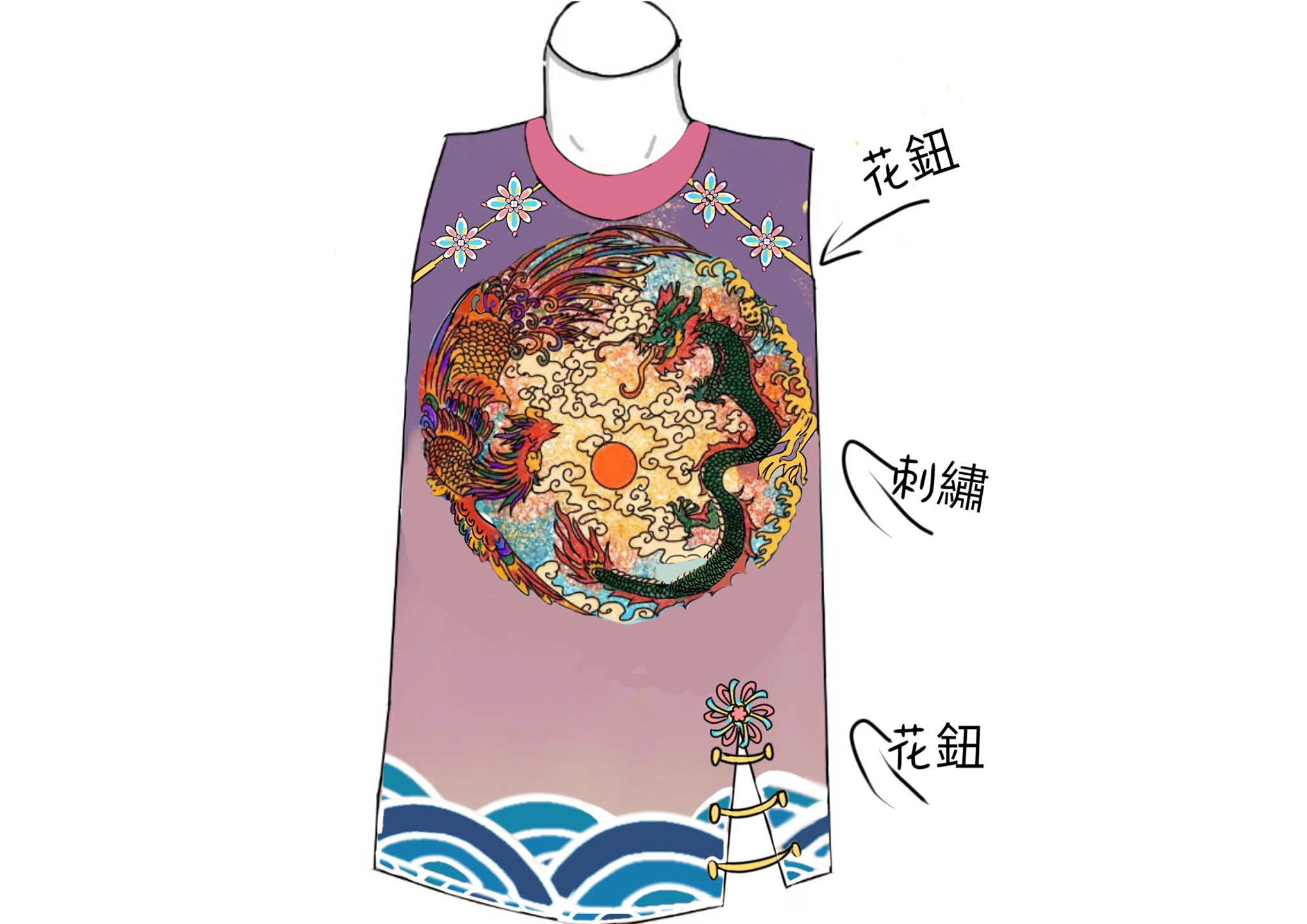 我的作品是龍鳳戲珠 。龍鳳下凡時,發現一塊漂亮的石頭,於是汲取日月精華打造它,但卻被王母娘娘取走 。他們爭奪時,珠子掉落凡間成西湖 ,龍和鳳就化身成西湖的玉龍山和鳳凰山 。兩肩及衫腳用了旗袍的花鈕點綴。