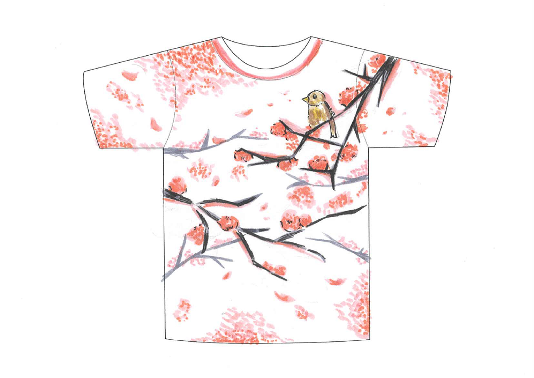 我用了梅花來與中國文化藝術的關聯,因為梅花很常會在中國綻放,每當提起中國的花,我第一時間都會想起梅花,而花上的麻雀是表達的是在梅花樹上欣賞著眼前的美景,並高聲歡唱的情景。