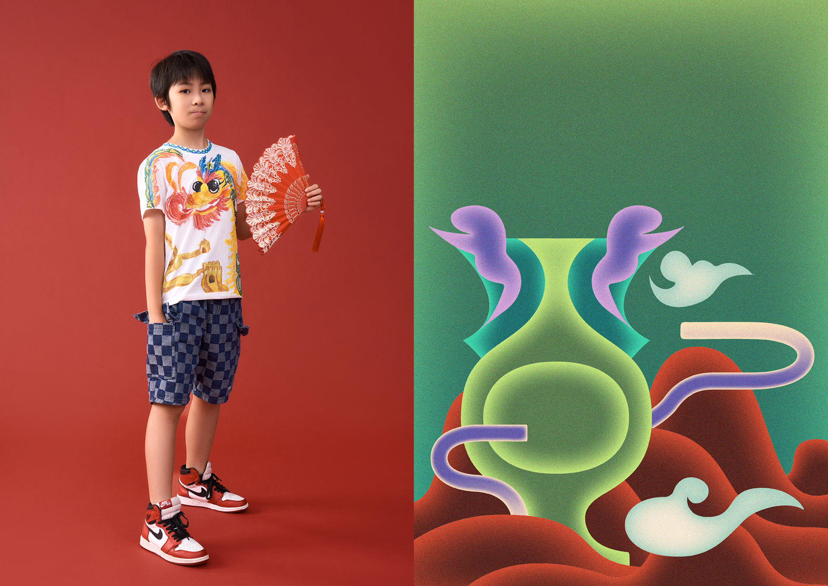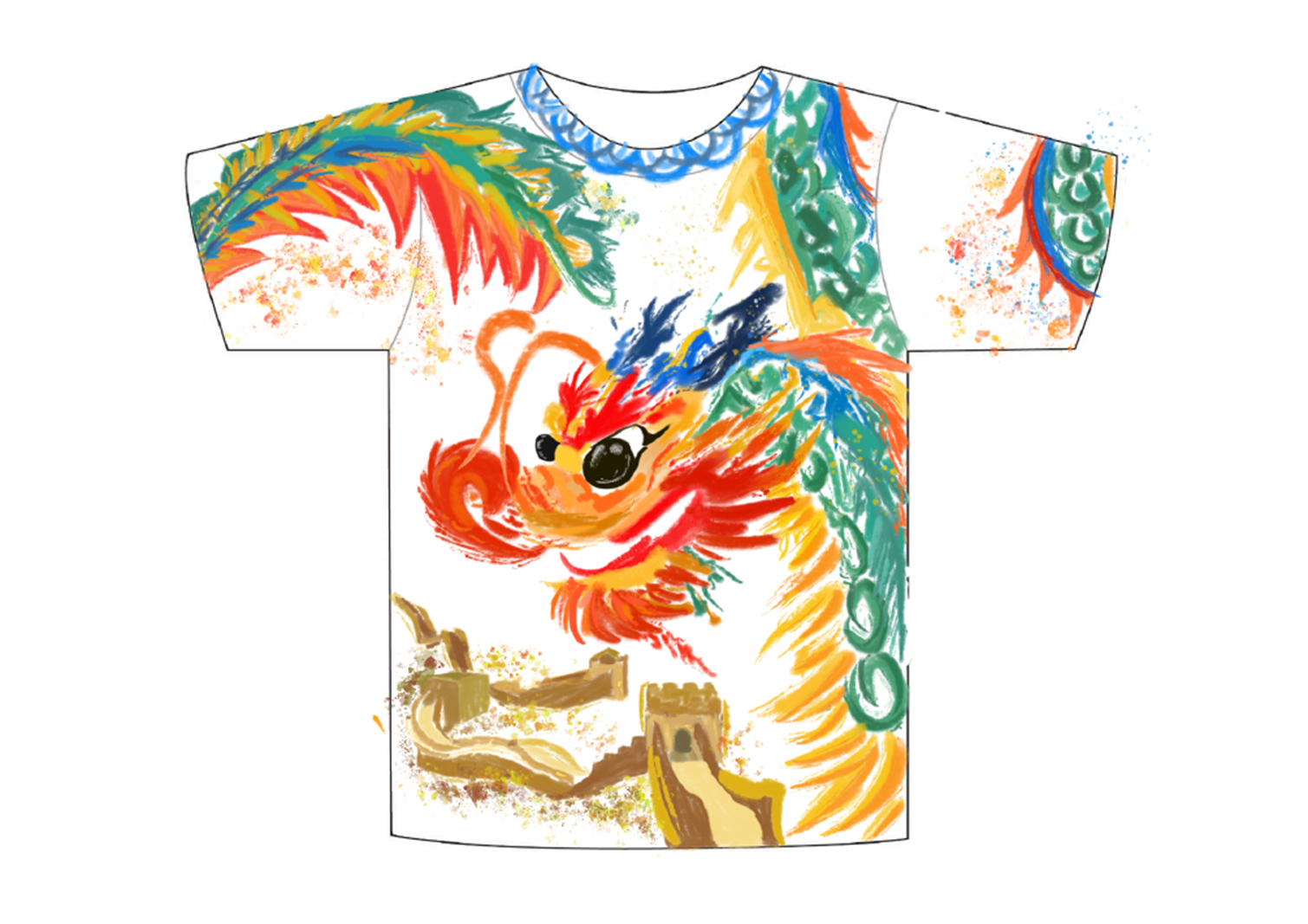 我的創作概念是《龍的傳人》,左下方我畫上中國別舉特色的景點:萬里長城,放眼上空是一條活力四射的彩龍,代表著中國龍的傳人,亦代表著活躍威武、吉祥的意思!設計上刻意混入中國文化氣式和時尚潮流的風格。