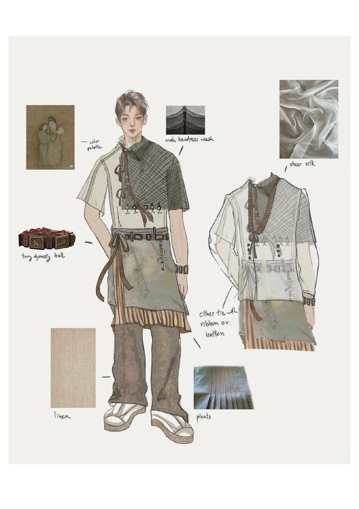 occasionally wear it today. I chose to do a semi formal style and focus on tailoring. I took inspiration from Song and Ming dynasty, the color palette used for Song’s silk paintings is soft and muted, it’s relaxing to the eyes and also gives an elegant look that’s not “old” for moderners. Ancient people might have tons oflayers for dressing, but the use of sheer silk can greatly relieve the heat of hot weather. I also reference Tang dynasty belt ornament to reflect the dedication of fashion in the time period. To add on, I made use of ribbons to attach clothing pieces and as a tie, pleating for half skirt to mimic the delicacy of how men were dressed.