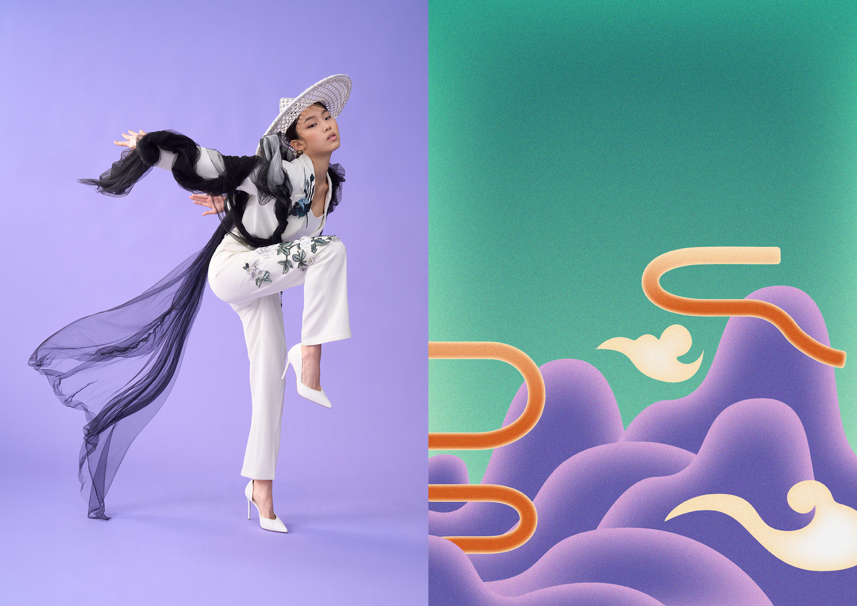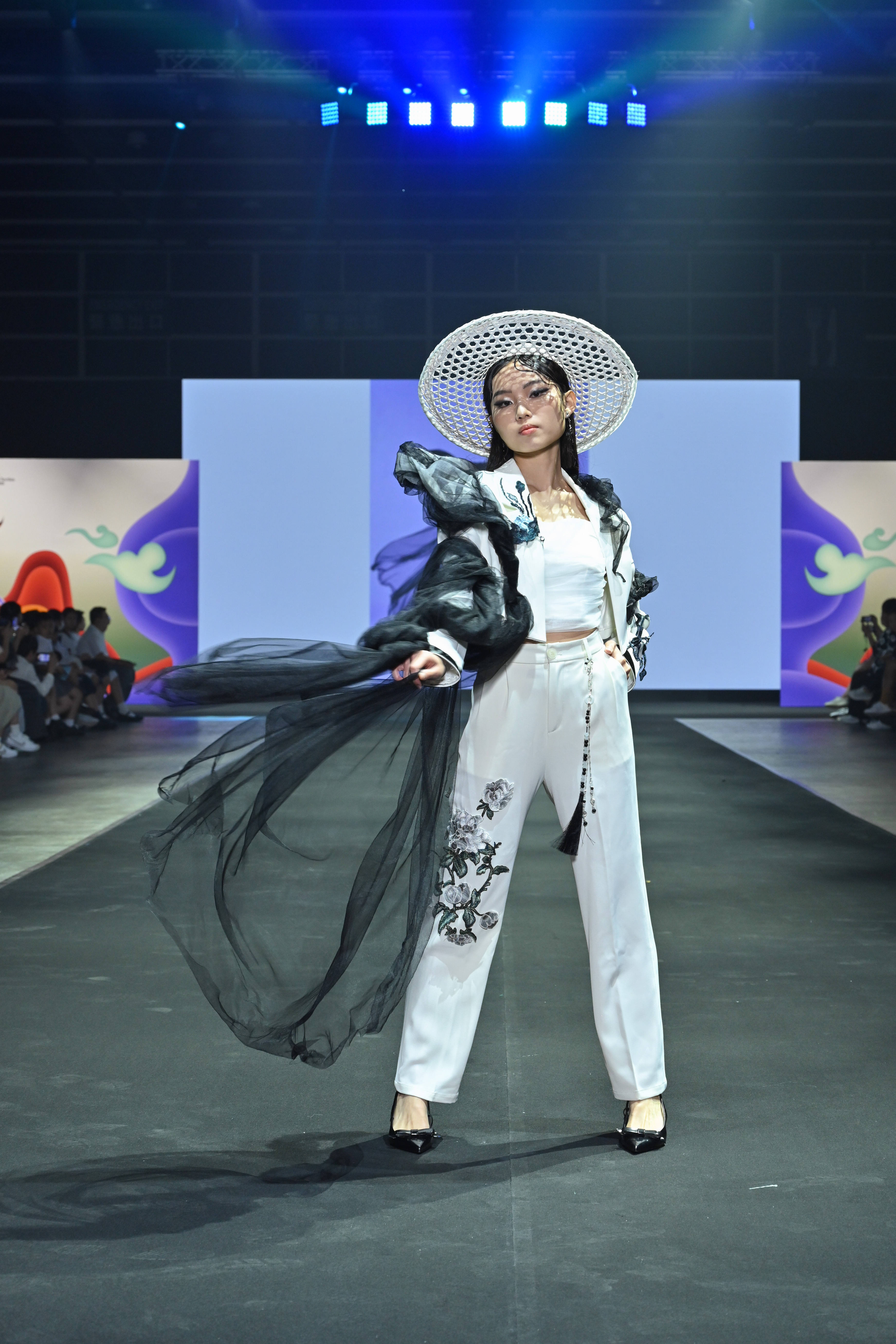 作品的主要服裝形式運⽤了旗袍和女款⻄式套裝作主要元素,旗袍是⼀種中國藝術⽂化的象徵,同時代表了中國傳統⽂化和歷史。⽽⻄式套裝則是代表了現今的時代,旗袍和⻄式套裝融合的設計元素則運⽤了⽔墨畫並以數碼印花的⽅法去呈現,將中國⺠國時代的服裝和歷史悠久的⽔墨畫結合在⼀起創造出新的融合服裝,旗袍和⻄式套裝的剪裁和細節設計也與⽔墨畫相互呼應,例如以上⾝本⾝設計的修長剪裁和線條以展示⽔墨畫中的筆觸和線條感增加了設計的層次感和視覺效果。⽽披肩的部份則運⽤了⿊⽩雪紡的⽅法去呈現出下雪時雪花飄飄的情景,在作品中希望能帶出和宣揚中國的⼭河美景和把中國的傳統服飾融合在⼀起。