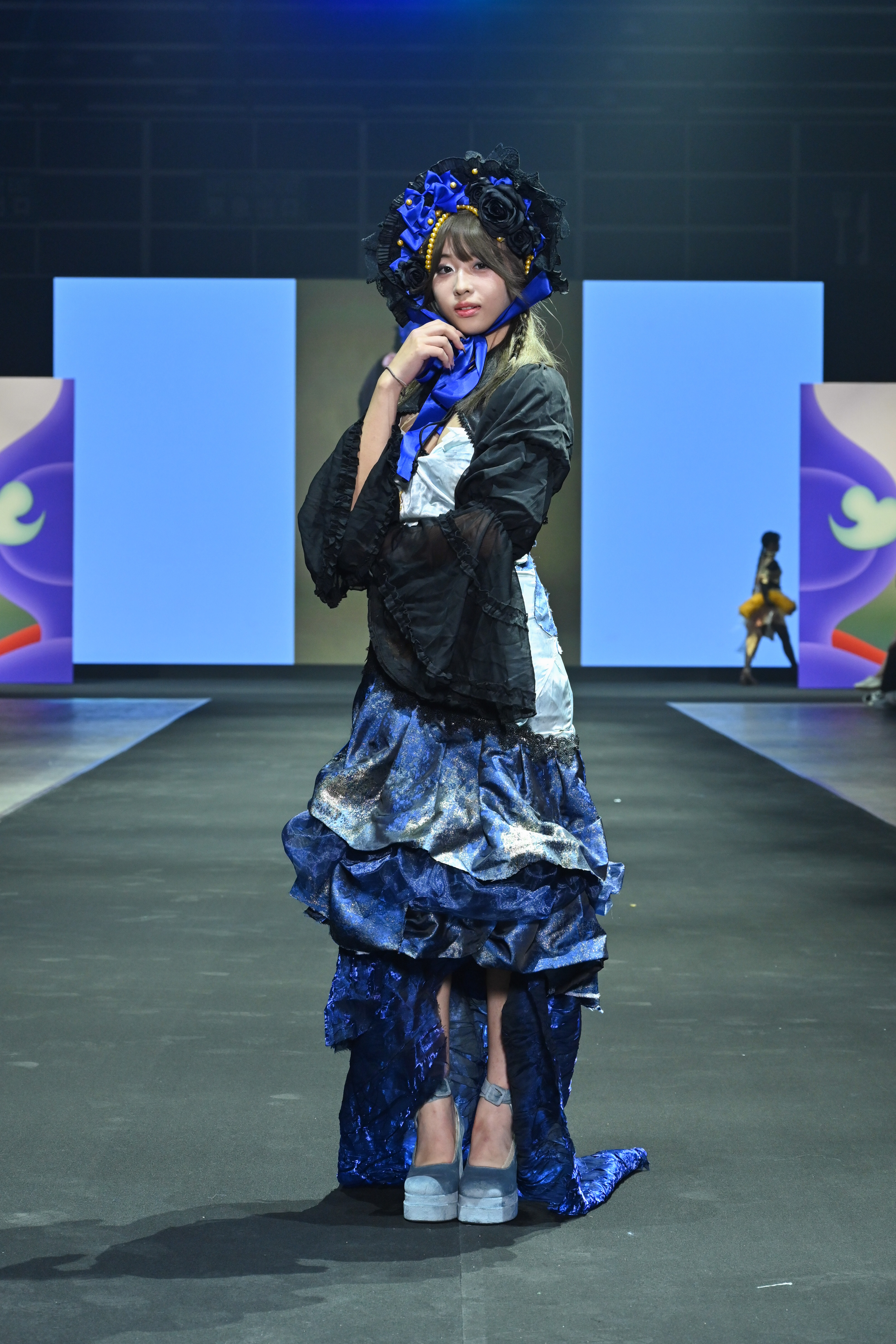 禮服配上中國元素的波奈特帽子,袖子除了姬袖設計,也加了漢服琵琶袖。上下半身的連接處加上蕾絲和拼色設計,層層重疊的裙擺,正好與旗袍作為對比。