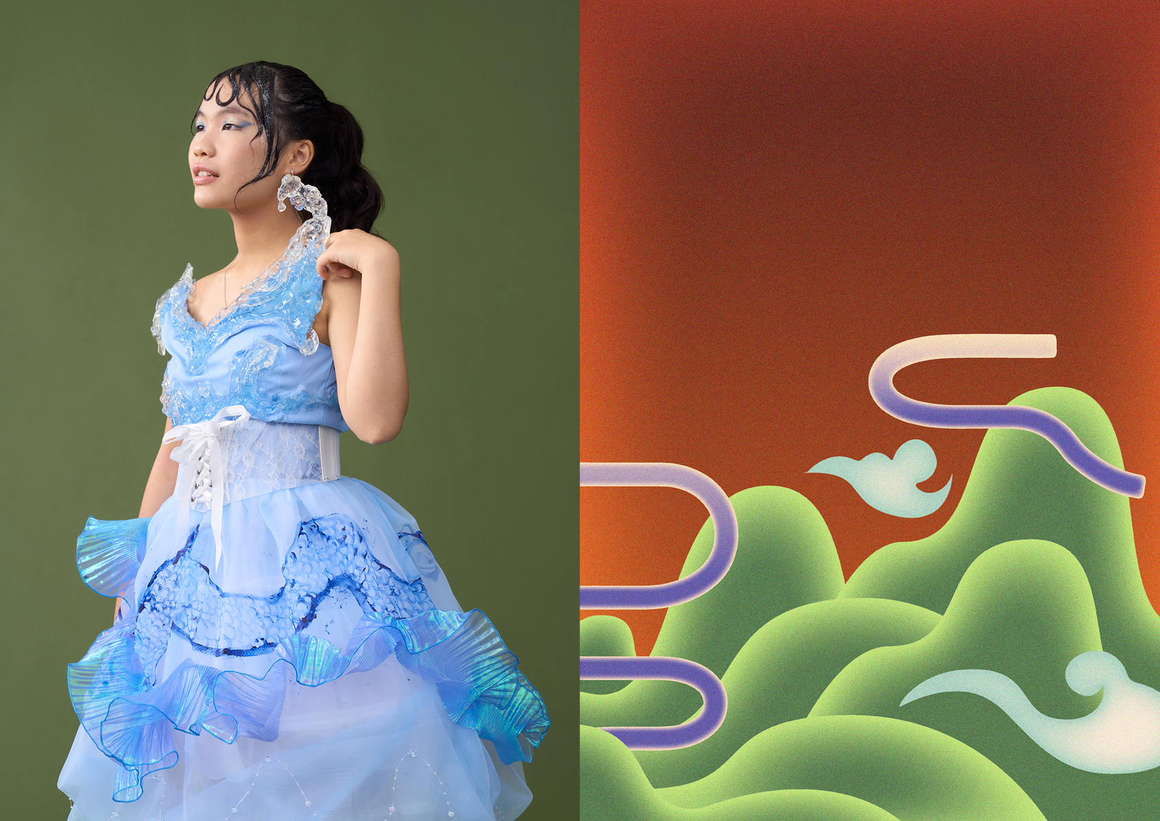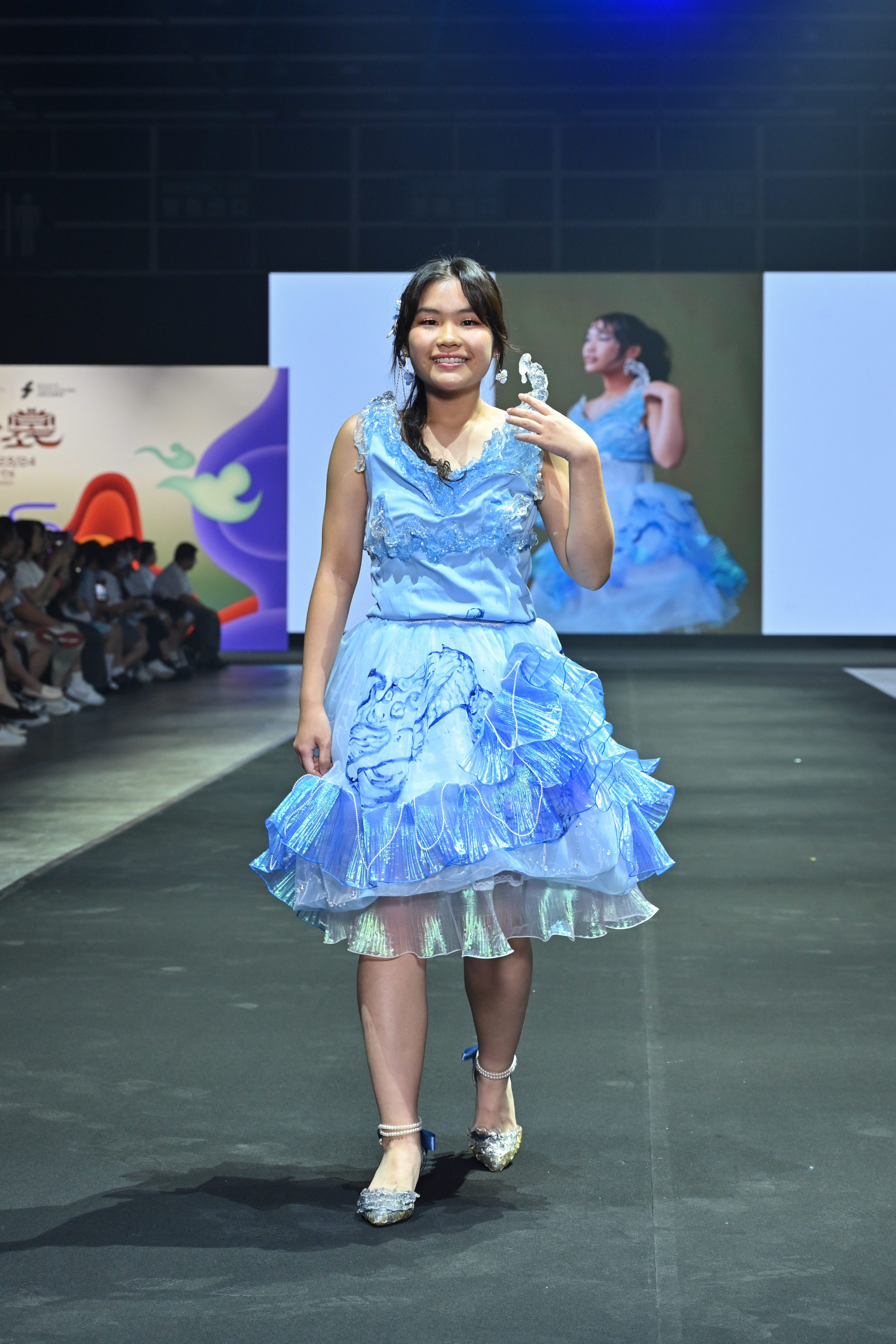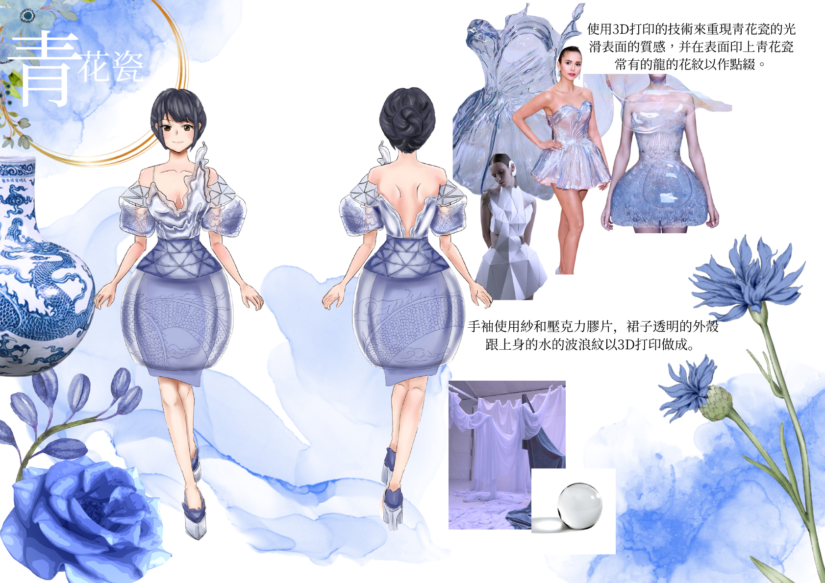 人的生活與水息息相關,而古代正正是使用瓷器來盛載水及酒,既華麗又實用。然而現今盛水容器越來越無趣乏味,剩下只有作爲容器的水瓶及杯子,現代人也漸漸把瓷器當作裝飾品,因此,我在裙子上嘗試設計出青花瓷盛水的動態,使其原本用處能像固體不會流動的塑膠爲主的裙子上不被忘記,也使它存在於自己最美的姿態。